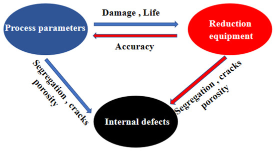 In addition to the exploration of process parameters, the researchers also improved and optimized the equipment factors related to the use of the SR technology, and they achieved good results [84,91,92]. Liu et al. [91] found that the clamping cylinder significantly affected the formation of volume shrinkage by using the roll gap model. They explored and optimized the SR parameters by studying the clamping cylinder from the perspective of equipment stability and accuracy. Moreover, the optimization of the clamping cylinder has remained a hot research topic to improve the product quality. Cheng et al. [92] compared the influence of different number of reduction rolls on the internal porosity of the slab by using single and multiple rolls to enhance the efficiency of SR technology. Currently, several researchers focused on the exploration of reduction process parameters and the adjustment of equipment related to reduction technology to implement the optimized parameters in the actual production process [51,56,90]. For example [93], the control of cooling water intensity and casting speed in the secondary cooling zone can accurately determine the reduction interval. Different reduction-related equipment, such as the shape of reduction rollers, i.e., flat or convex shape rollers, will also affect the SR technology. The optimization of combined reduction process parameters and reduction equipment resulted in the outstanding quality of cast product, while the improper selection of the reduction parameters has adverse effects on the equipment life and the internal quality of the product. Moreover, the improper adjustment of equipment and insufficient accuracy will lead to misjudgment of reduction parameters and even serious accidents during the actual production process. The impact of these parameters and equipment on billet quality is shown in Figure 5.