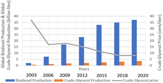 - Ayoub, M.; Abdullah, A.Z. Critical review on the current scenario and significance of crude glycerol resulting from biodiesel industry towards more sustainable renewable energy industry. Renew. Sustain. Energy Rev. 2012, 16, 2671–2686. [Google Scholar] [CrossRef]