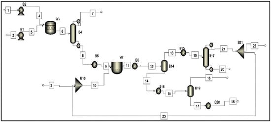 These reactions are carried out in a continuously stirred tank reactor recommended by several sources for esterification [50,51]. As these reactions are carried out in a CSTR, they must be specified more than the ones in a batch reactor. These specifications are the thermodynamic and kinetic data, i.e., the reaction rate constant and the frequency factor. These values were obtained from previously reported experimental data to be 0.0006 s−1, 50.5 kJ/mol, and 4.05 s−1 [52]. The methanol-to-oil ratio is one of the most important things in the design of this reactor mainly because most of the methanol is recycled back to the reactor. The fresh methanol-to-oil ratio was calculated by sensitivity analysis to be 2:1 for maximum conversion. The rest of the process is basically separation and further refining to give a product with a high methyl ester mole fraction as well as recycling of the methanol, as shown in Figure 2.