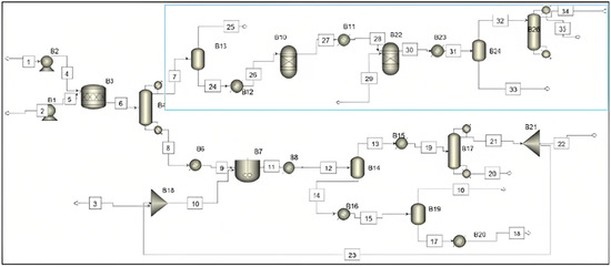 Stream number 7 is the crude glycerol stream from which water becomes separated in flash drum B13. The bottom product is sent into the pyrolysis reactor B10, then it is sent into the steam fanning reactor, B22. After the liquid components of the resulting streams are knocked out in flash drum B24, pressure swing adsorption is carried out in equipment ID B26, and the 90% pure hydrogen stream number 34 is the final product of the extension.