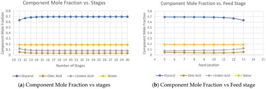 The mole fractions represented in these figures are of the crude glycerol stream, 7. It can be deduced from Figure 4a that, after 15 stages, the amount of glycerol in the top stream has reached its maximum mole fraction, and the acids have reached their minimum value. Similarly, for the second sensitivity analysis, the best feed location is determined to be 5 as shown in Figure 4b.