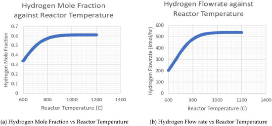 The relationship between Hydrogen mole fraction against reactor temperature is shown in Figure 5a. The result of Hydrogen Flow rate against reactor temperature is shown in Figure 5b. Both findings demonstrate that the graphs are steady and rising concurrently. With this temperature, both the parameters plateau at 910 °C. Therefore, the reactor temperature needs to be set at this value.