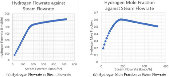 The goal of the Gibbs reactor placed in this simulation is used to maximize the amount of hydrogen in the product stream 30. The data from the sensitivity analysis help to decide the stream amount. The mole flow of the hydrogen in kmol/h is the clear choice to define for the analysis, but it is also important to make sure that the mole fractions are consistent with the increase or decrease in mole flow. The two critical parameters for hydrogen production are the reactor’s temperature and the flow of steam going into it. Figure 5a,b represent results from the sensitivity analysis.