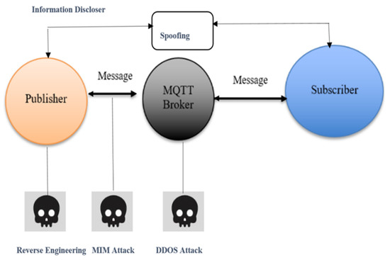 The default configuration of MQTT does not support authentication or payload encryption schemes because it is a lightweight, simple, and generic protocol. Wildcard support appears to be a glaring oversight since it creates a flaw that allows an adversary to listen in on any data passing through the broker. The MQTT is not designed with security as a primary concern [6,25]. In order to enable bidirectional communication and remote control of IoT devices, middleware based IoT application protocols are indispensable. MQTT is one of the most widely adopted IoT application protocols. Identifying possible threats is necessary before implementing countermeasures in MQTT-based IoT environments. The MQTT threat model is presented, and the attack against MQTT brokers is evaluated. That protocol used the publish-subscribe model. This paradigm demonstrates how the “broker,” a crucial element in MQTT, separates the “publisher,” a client that publishes messages, from the “subscribers,” which are other clients that receive the messages. This task involves receiving messages from the publisher and sending them to the subscribers. Figure 1 shows the MQTT threat model. As one of the most popular IoT application protocols, Patel, C. et al. [6] outlined the threat model for MQTT and examined the denial of service (DoS) attack encountered when MQTT brokers are attacked. A virtual machine testbed was set up for the investigation of the performance of an MQTT broker server during a DDoS attack.