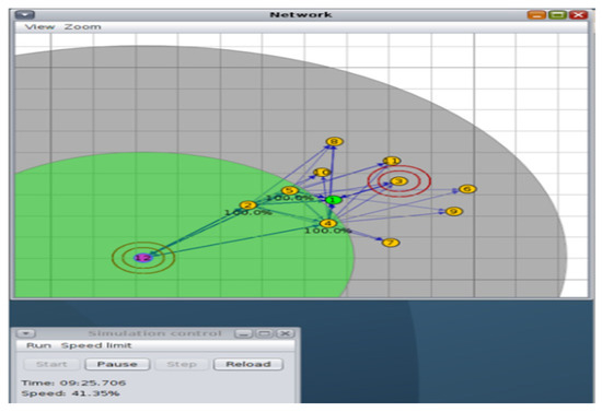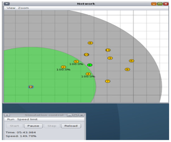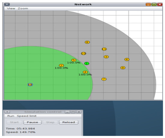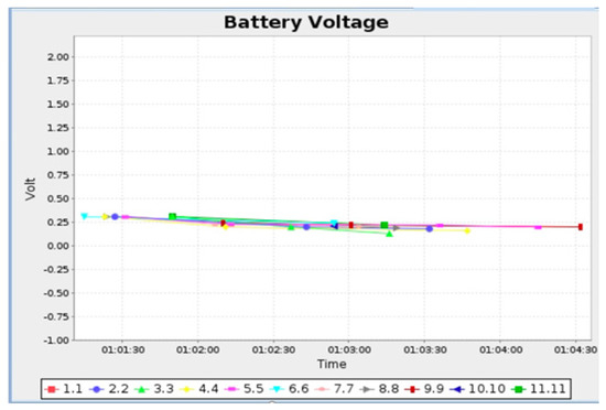 There were two scenarios for this simulation; the first was to evaluate the power consumption and the number of packet losses. The second was to detect anomalies in the WSN due to DoS attacks (HELLO flood attacks) to detect the hacker among many clients. With some skill in using the tools, we can achieve this simulation result. We performed this simulation process based on three criteria [31,32]. These criteria were battery voltage, average power consumption, and packet loss over time.