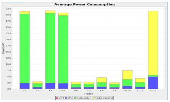 Figure 6 shows the network under attack, and Figure 7 shows the average power consumption during the attack. All sender nodes (2 to 12) consumed almost the same current, which is at a low level of about 1.2 mW. If we compare nodes (2, 4, 5) and 12 (attacker) with other nodes, we see that they have a much higher power consumption of about 30 mW. The power consumption of the other nodes is also higher than before and is about 2.5 mW or even higher. For node 12 (attacker), we found that radio transmission accounts for a large part of the power consumption since it is constantly sending messages to nodes 2, 4, and 5. For nodes 2, 4, and 5, the simulation shows that listening accounts for a large portion of the power consumption since they constantly receive requests from node 12.