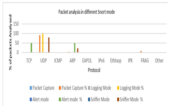 The more rules that need to be matched, the slower the IDS, and the more packets are dropped. Snort has three main uses. It can be used as a pure packet sniffer such as tcpdump, a packet logger used to debug network traffic. Snort logs packets in tcpdump in binary format and names them by their IP address. In packet capture mode, Snort received 142 packets, analyzed 70 packets (49.2%), and discarded 0 (0%), 63 UDP packets, 0 TCP packets, 2 ARP packets, and 6 fragmented packets. In packet logging mode, Snort analyzed 17 packets (47.2%), dropped 0 (0%), logged 17, and issued 0 alarms. In alert mode, Snort analyzed 4 out of 4 packets and discarded 0 (0%). In sniffer mode, Snort analyzed 14 packets and discarded 0 (0%) (Table 9). Figure 11 shows the analysis of packets in the different Snort modes. Network throughput increases with average packet arrival (packets/time slot) and maximum buffer size. This reflects the effectiveness of the rules applied to ensure that as many packets as possible successfully arrive at their destination.