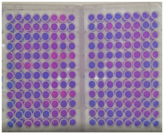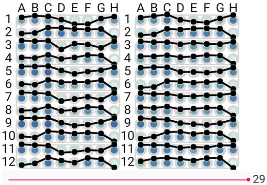 A sample of the data generated by these experiments is shown in Figure 2. Here, each plate is divided into blocks of eight rows (A–H) and 12 columns (1–12). For each plate, the blocks starting at A1, A3, A5, A9, and A11 are always filled with a positive control. Thus, negative controls are located on H4, H8, and H12. The blocks starting on plate 1 (A3, 7, 11) all have antibiotic a, and blocks starting on plate 2 (A3, 7, 11) all have antibiotic b.