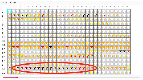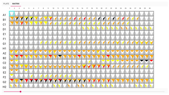 A summary of the patterns found during the evaluation of the well explorer application is shown in Table 1. By using the traditional method, our test users were able to find a total of seven distinct insights. Using the software developed for this study, they were able to find an additional 10 patterns and 17 patterns in total. Typically, these were more complicated insights where distinct patterns needed to be combined. An example of this is shown in Figure 10. Here, we can observe that both spot B1 and G2 can both detect and differentiate antibiotic A and B. This indicated that these biosensors are good candidates to be included as spots in the resulting biochip design. Overall, the results indicate that our software has the capability to reveal patterns from experimental data that can better support biochip design.