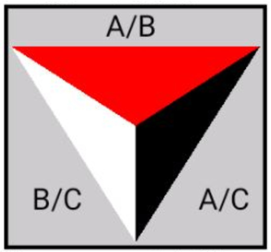 We divide the glyphs into three sections, and for each row and time point, we perform three paired t-tests on each row and every time point. The t-test result between antibiotics A and B is displayed on top, the result contrasted with antibiotics A and the control is shown on the right, and the result between antibiotic B and the control is shown on the left. The colour represents how well the sensor can distinguish between the two antibiotics and the control. The triangle’s five colour selections are coloured as the following:
