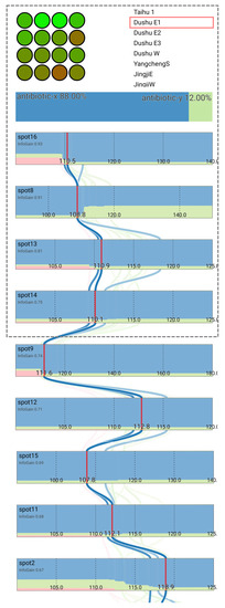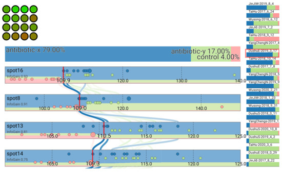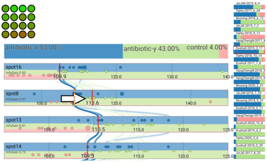 Users can interact with the interface to investigate the sensitivity of their classification to changing spot values. This can assist users in better comprehending the classification and uncertainty in their data. For instance, by choosing the sample DushuE 2019-31-7 (Figure 12), the classification antibiotic x may be sensitive to shifts in the value of spot 8. We can identify the possible difference in the confidence in the classification toward antibiotic y by clicking and dragging to change this spot value (with the red line and classification animation gradually to a new hypothetical value) (Figure 13).