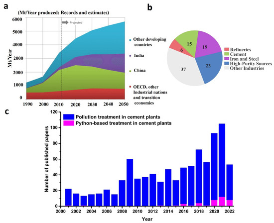 The urbanization and industrialization of communities have led to environmental pollution and global warming concerns around the world. Among diverse polluting industries, cement complexes are one of the most critical zones under the red class [1,2,3]. After water, cement is ranked as the most consumed substance in developing and developed societies. Cement is used in construction, civil engineering [4,5], decorative applications [6,7,8], medical and dental fields [9,10,11], and many more. Statistics illustrated the production of about 3600 million metric tons of cement in 2021 by several countries: China, India, Vietnam, the United States, Turkey, Indonesia, Brazil, Iran, Russia, Japan, Mexico, South Korea, and Egypt [12,13]. Based on the predictions, cement consumption will reach up to 5800 million metric tons by 2050, as presented in Figure 1a [12]. Meanwhile, the CO2 pollution emitted by these plants constitutes around 10–15% of the total CO2 released into the environment per year among the main industries, including refineries, iron and steel, high-purity sources, and other sectors (see Figure 1b) [13]. The extraction of limestone and various production procedure of cement cause hazardous impacts on the environment and degradation of landscapes, resulting from dust pollutants and overburdened material dumping [14,15]. The cement industries generate a wide range of contaminations affecting human health directly and indirectly. The emission of the particulate materials, oxides, sulfides, and other contaminants through the output air into the environment is potentially able to affect human well-being. The released wastewater and solid wastes can pollute the soil, drinking water, and agricultural products, which impact human life indirectly. Therefore, the prediction, monitoring, and treatment of the resulting pollution from cement plants have been initiated for several years [16,17]. It is noteworthy that solar calcination has been extremely focused in developed countries in recent years to dramatically reduce CO2 emissions. Using such progressed systems efficiently decreases the need for pollution monitoring systems while approaching the solar calcination seems to be not realistic in the near future [18].