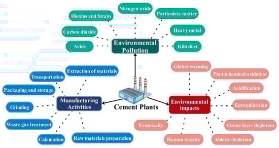 During all production phases, pollutant materials are emitted to various media resulting in human health problems. These adverse effects could be transmitted to humans by direct (air inhalation) and indirect ways (distribution in soil, water, etc.). According to the literature, respiratory, gastrointestinal, lymphatic, and central nervous system impairments are the most reported health issues caused by the aforementioned pollutants [16,31,33,34]. Figure 2 describes the drawbacks of cement complexes dealing with environmental problems. To overcome the downsides, the inherent physical–chemical features of the various pollutants, their degradability properties, and many more characteristics should be accurately evaluated. The pollutant materials emitted from the cement industries are classified into five categories: solid waste, wastewater, air emission, noise pollution, and waste fuels, which are summarized in the following.