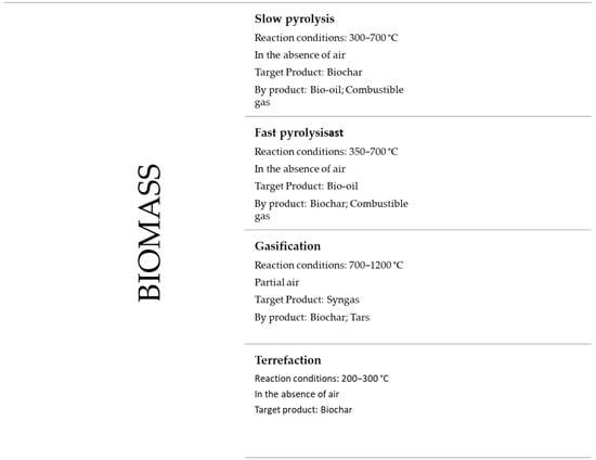 For biochar production, several thermochemical processes are used based on different reaction conditions (amount of oxygen available) including pyrolysis, gasification, and torrefaction. In this way, several types of reactors were developed for biomass production, with the objective of achieving the highest quality and yield of the product. These reactors differ in certain thermochemical parameters, such as oxygen availability, temperature, and the rate of heating itself. Thus, these parameters vary the physical and chemical properties of the biochar [8]. The following Figure 2 shows these several methods [8].