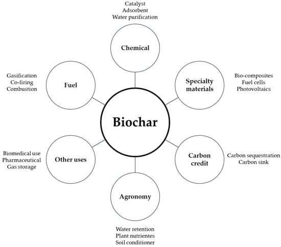 Another biochar application studied is soil remediation and amendment. Biochar has been considered an appropriate matter for this purpose, allowing the absorption and modification of pollutants, through their properties previously mentioned, associated with physical adsorption on the surface and in micropore structures [52].