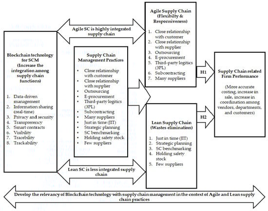 This study derived SC practices based on agile and lean approaches: seven practices are linked to agile SCs (close partnership with customers, close partnership with customers, outsourcing, e-procurement, 3PL, subcontracting, and many suppliers), and five practices belong to lean SCs (JIT, strategic planning, benchmarking, holding safety stock, and few suppliers). Agile and lean SCs improve a firm’s SC-related performance by providing more accurate costing, increasing sales, and increasing coordination among vendors, departments, and customers. Below, we analyze the impacts of agile and lean SCs on firm SC performance based on hypotheses H1 and H2, respectively. The proposed framework of this study is presented in Figure 2. This study identifies the relationships between the agile and lean SCs and firm SC performance and examines the relevancy of blockchain properties to agile and lean SCs (refer to Table 1).