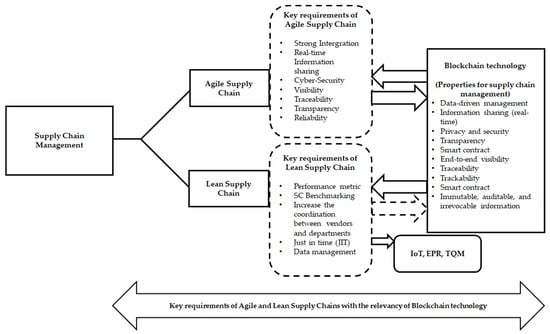 The respective needs for blockchain for agile and lean SCs are illustrated in Figure 3. The literature shows that blockchain has numerous and highly significant properties for SC management. The relevance of blockchain to agile and lean SCs is shown in Table 1. The key requirements of an agile SC are strong integration, real-time information sharing, data privacy, security, visibility, traceability, transparency, and reliability. These requirements are closely related to the blockchain properties for SC management [,,,]. The key requirements for lean SCs are performance metrics, benchmarking practices, and effective coordination among SC partners, stakeholders, and departments [,,,]. Blockchain technology is the best solution for fulfilling these requirements, but the literature suggests that these requirements can be fulfilled using less expensive technology-based solutions, such as IoT, ERP, and TQM practices [,,,]. Therefore, this study concludes that a lean SC is less integrated and has low trust issues because the adoption of blockchain requires a significant amount of capital. The adoption of blockchain according to its properties under the agile and lean SC key requirements described in Table 1 is shown in Figure 3.
