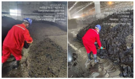 Before collecting samples, it was necessary to first understand the generation process of coarse coal gasification slag (CCGS) in order to determine the sampling plan. The generation process of CCGS is as follows: the high temperature coarse coal and gas leaving the reaction chamber and the liquid slag enter the quench chamber together. The slag is solidified in the water bath and sinks to the bottom of the gasifier. The slag water flows into the slag trap, and relatively clean water at the upper part returns to the bottom of the quench chamber of the gasifier. Through this water circulation, the slag, and other solids at the bottom of the chilling chamber, are flushed to the slag trap. The slag trap outlet valve is opened, the water and slag in the slag trap is replaced with cleaner water, and the slag and water is sent to the slag machine in the slag tank. After the CGS is pulled out by the slag scraper, there is a temporary slag field, and the slag water containing the fine slag is sent to the first vacuum flash separator of the black water flash system. Therefore, the CCGS is collected at the slag tank and slag field. Sampling was done in strict accordance with the industrial solid waste sampling technical standard (HJ/T 20-1998).