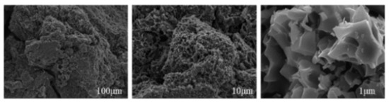 The scanning electron microscope result (Figure 2) shows that the coarse slag particles of coal gasification are angular, uneven in size, amorphous carbon block distribution, and the surface is composed of irregular porous structure, showing honeycomb holes and large roughness. This morphology is related to the formation of water quenching of coarse slag in the molten state of silicon and aluminum. Porous structure can be considered as applied to adsorption, including pollution control or water and fertilizer research.