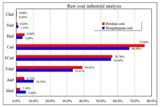According to the results of Figure 4 and the classification of Chinese coal and the ash composition table of Chinese coal, Hongshaquan coal and Heishan coal belong to bituminous coal. Hongshaquan coal has a high ash content and low volatility. A high ash content means that the coal consumption in the gasification process increases. Correspondingly, the workload of the gasifier and ash treatment system also increases. In terms of volatile matter, the content of coal with a low degree of coalification becomes higher, i.e., the ‘younger’ the coal, the better its reactivity in gasification, and the more efficient it will be throughout the gasification process. Compared with Hongshaquan coal, Heishan coal has the characteristics of low ash, low sulfur, and is of good quality.