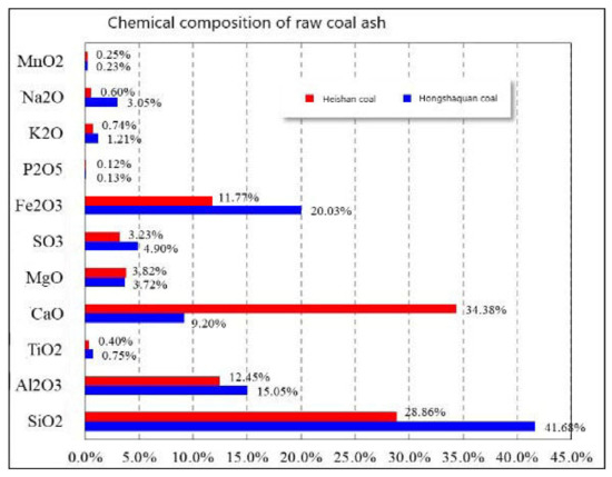 Acid oxide has the ability to increase the ash melting temperature: the higher the acid oxide content, the higher the melting temperature. The effect of alkaline oxide is the opposite: the higher the content, the lower the melting temperature. The chemical composition of coal ash has an important influence on the formation of slag in the gasification process of raw coal through the melting temperature. The gasifier provides a high-temperature and high-pressure environment. The raw coal produces physical and chemical changes in this environment, and eventually produces solid matter, namely, the slag. The ash composition analysis of raw coal is shown in Figure 5. Compared with Heishan coal, the content of acidic oxides in Hongshaquan coal is higher and the content of alkaline oxides is lower. The above chemical composition content factors are the reason why the melting temperature of Hongshaquan coal is higher than that of Heishan coal. Overall, the chemical substances and composition in the coal sample not only affect its own melting characteristics, but also inhibit or accelerate the gasification process.