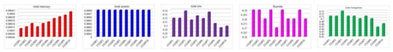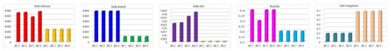 Figure 6 shows test results of pH, fluoride, total chromium, hexavalent chromium, total cyanide, total mercury, total arsenic, total cadmium, total lead, total nickel, total zinc, total copper, total manganese, total beryllium, total silver, sulfide, alkyl mercury and other characteristic pollutants in Hongshaquan coal and Heishan coal. The samples of Hongshaquan coal were recorded as RC1, RC2, RC3 and RC4, respectively, and the samples of Heishan coal were recorded as BC1, BC2, BC3 and BC4, respectively. It is important to note that total cadmium, total chromium, total lead, total nickel, total cyanide, total copper, hexavalent chromium, total beryllium, total silver, methyl mercury and ethyl mercury were not detected.