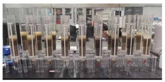 In order to explore the effect of CCGS on soil water and fertilizer retention, the infiltration test of different treatments of improved materials was carried out by intermittent soil column leaching method, the characteristics of soil water content and soil fertility after leaching were analyzed, the mechanism of water and fertilizer retention of improved materials was further studied, and the water and fertilizer retention capacity of the improved materials with different ratios and pure soil was comprehensively compared and analyzed. The design of the soil column experiment is as follows: the soil column experiment was set up with four CCGS gradients (5%, 10%, 15%, 20%), and the soil column without the improved material was used as the control. Three parallel tests were performed for each ratio, as shown in Figure 9.
