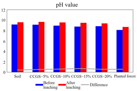 It can be seen from Figure 12 that pH value of soil decreased after adding CCGS before leaching, and the pH value of soil with 20% CCGS was the lowest, and there was no significant difference in pH value between different CCGS content. After leaching, the soil pH value increased. Compared with the CCGS, the soil pH was higher than that of the CCGS regardless of whether the CGS was added or not. The soil pH values of 15% and 20% CCGS were lower, and the difference was close to the CCGS. In terms of soil pH, 20% CCGS had the best effect.