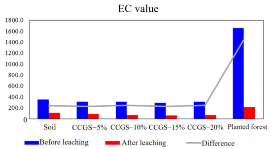 Soil electrical conductivity is an indicator of soil water-soluble salt, and soil water-soluble salt is an important attribute of soil, which is the factor to determine whether salt ions in soil influence crop growth. The analysis of water-soluble salts in soil is of great significance to understand the salt dynamics, the impact on crop growth and the formulation of improvement measures. As shown in Figure 13, the soil EC was high before leaching, and the electrical conductivity decreased with the increase of CCGS content. The soil electrical conductivity was low after leaching, and the electrical conductivity decreased with the increase of CCGS content. Compared with the planted forest sample, the conductivity value was low, and a 20% CCGS effect was best for the soil EC.