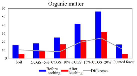 As shown in Figure 16, before and after leaching, the content of ammonium nitrogen changed significantly with different CCGS contents, and the difference gradually decreased with the increase of CCGS content. The results showed that the addition of CGS could maintain the soil ammonium nitrogen, and the higher the content of CCGS, the stronger the retention effect. Taking the planted forest sample as the expected target of improvement, it can be found that when the CCGS is 20%, the retention effect of ammonium nitrogen is better than that of the planted forest sample, but the content is far less than that of the planted forest sample.
