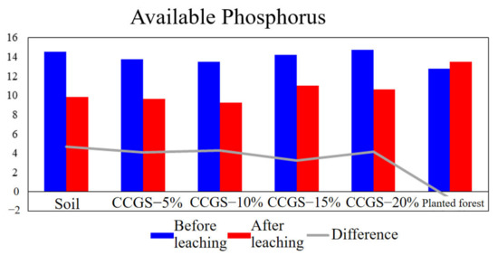 As shown in Figure 17, before and after leaching, under different mixing ratio, the relative change of available phosphorus content is not obvious, and the difference decreases with the increase of CCGS content. Studies have shown that the addition of CCGS can keep the soil-available phosphorus, and the higher the CCGS content, the stronger the retention effect. Taking the planted forest sample as the expected goal of improvement, it can be found that when the amount of CCGS is 20%, the retention effect on available phosphorus is better than that of planted forest, and the content is close to that of the planted forest sample.