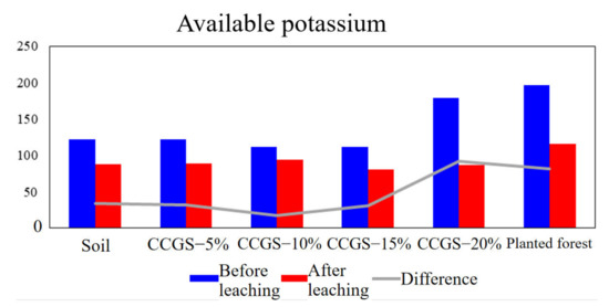 As shown in Figure 18, before and after leaching, the content of available potassium changed significantly with different CCGS content, and the difference increased with the increase of CGS content. The results showed that the addition of CGS had a weak effect on soil available potassium, and the higher the content of CGS, the weaker the effect. Taking planted forest as the expected goal of improvement, it can be found that when the amount of CGS is 10–15%, the retention effect of available potassium is better than that of the planted forest sample, and the content is close to that of the planted forest sample.