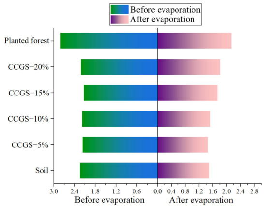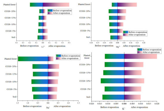 It can be seen from Figure 19 that the addition of CGS increased the content of magnesium ions, potassium ions and sodium ions in the soil. The calcium ions, magnesium ions, potassium ions and sodium ions in the soil before evaporation and after adding CGS were higher than those after evaporation. The content of calcium ion, magnesium ion and potassium ion increased after evaporation in the treated group of planted forest samples, while sodium ion decreased. The addition of CGS was able to reduce the content of calcium ion and potassium ion in soil after evaporation but had no effect on other cations.