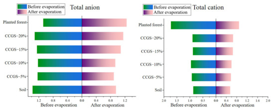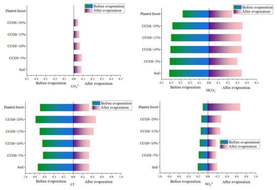 In summary, the addition of CCGS increases the ion content, but mainly acts on soil cations, and has a relatively weak effect on soil anions. The sum of the eight ions in the soil before and after evaporation is reduced, as shown in Figure 21 and Figure 22.