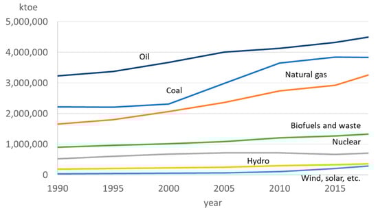 Total energy supply in ktoe in the world from 1990 to 2018. Extracted from IEA [1].