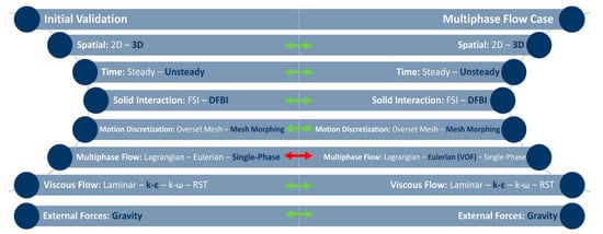 The initial model approximation was carried out to compare the experimental curve and the analytical data shown in Figure 7. These curves were developed using water. Therefore, a multiphase model was not employed yet. The turbulent flow was assumed and analyzed using the realizable k-ε RANS model. Additionally, gravity was considered an external body force. To achieve the interaction between the fluid and the plate, the DFBI and mesh morphing models were considered. A summary of the models implemented is shown in Figure 8. To analyze the computational model with a real scenario likely to occur in a typical reservoir, a multiphase model with excellent oil/water interaction performance was implemented. An Eulerian model was used; precisely, the volume of fluid (VOF) model. In addition, all models remained exact (Figure 8).