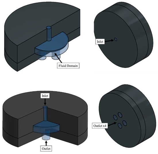 The boundary conditions were defined by the differential pressure between the inlet and outlet of the valve. The inlet’s pressure depended on the experimental point to be simulated. In contrast, the four outlets were set at 0 bar, achieving the experimental pressure drop. A schematic showing the computational domain and boundary conditions is shown in Figure 9.