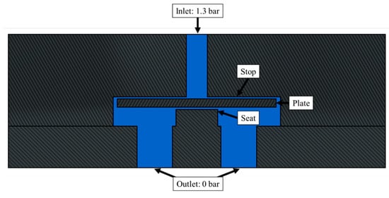 The DFBI model was used to simulate the plate’s movement due to the interaction with the fluids. Furthermore, the movement had to be constrained between the top and bottom seats in the stop and seat. Therefore, contact conditions had to be defined as shown in Figure 9. The contact coupling condition required the iterative and manual tuning of parameters to generate an opposing force, such as the effective distance, and the elastic and damping coefficients, depending on the body’s velocity and mass and the boundary’s contact area. Although these parameters could be manually calculated based on the model’s analytical equations for single-phase flow (Equations (17) and (18)), they became the first approximation because they required a further iterative manual tunning for multiphase flows. The plate was initially in the center of the chamber. Moreover, the valve was left wholly filled with water; this same fluid was injected into the inlet in the initial conditions. The properties of the water are shown in Table 2.