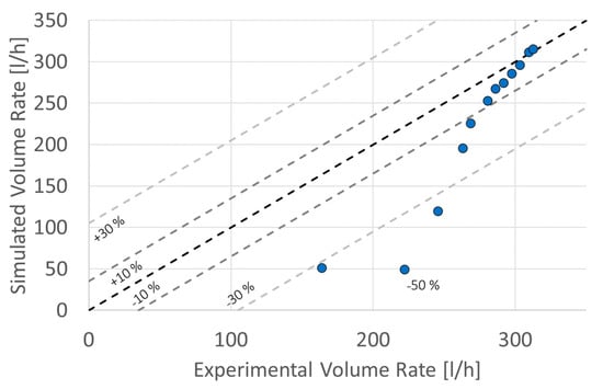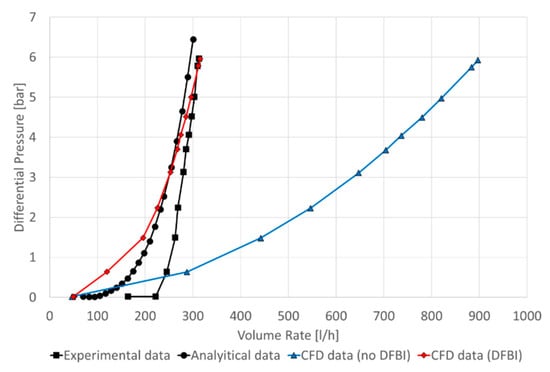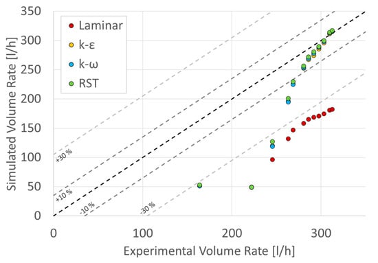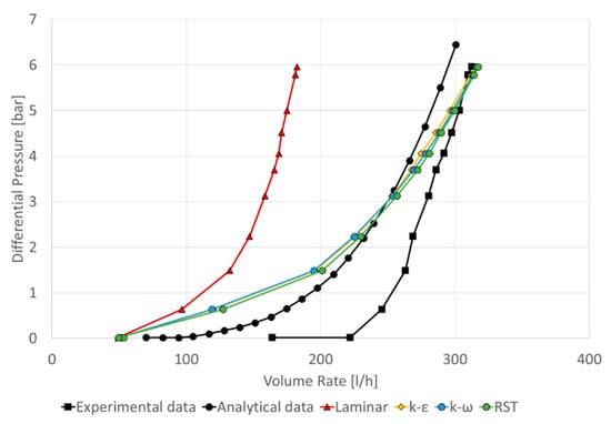 The simulated curves showed a choking effect via an asymptotic behavior in the differential pressure. However, the results that corresponded to the laminar flow were distant from both the experimental curve and the analytical data. On the other hand, the three simulated results with a turbulent flow regime presented the same behavior and the differences between the data were negligible. The turbulence models followed the same behavior as the data used for the validation, as seen in Figure 12: the pressure difference for low volume rates was distant from the experimental data but close to analytical data. As the volume rate was increased, the data approached the experimental curve. The percentage differences between the experimental and simulated data are shown in Figure 18.