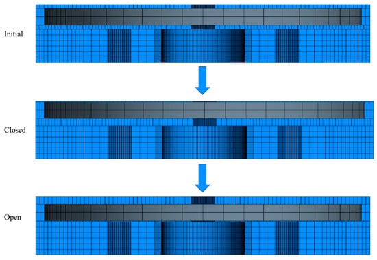 The Figure 14 shows that the mesh cells could not disappear or have an area equal to zero because that would generate an error in the discretization. On the other hand, the cells that closed horizontally to the side of the plate did not suffer any deformation; this was defined to maintain the plate’s geometry without variations. Thus, the deformation was implemented only in the vertical direction.