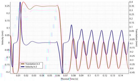 The model had to predict the plate’s vibration or oscillation in a closed position; therefore, analyzing the displacement through time had to reveal this behavior. Figure 15 shows the translation and velocity of the plate throughout time.