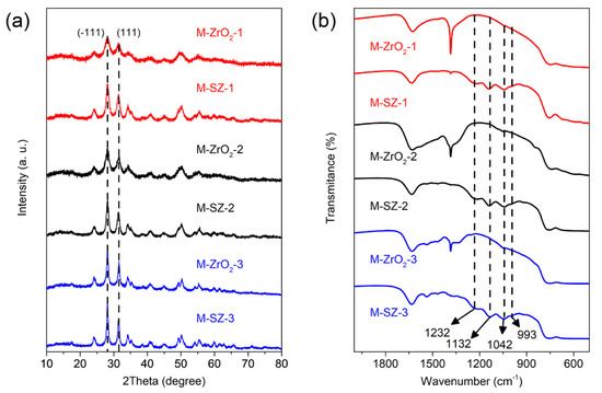 (a) The XRD patterns and (b) FT-IR spectra of M-ZrO2-1, M-SZ-1, M-ZrO2-2, M-SZ-2, M-ZrO2-3, and M-SZ-3.