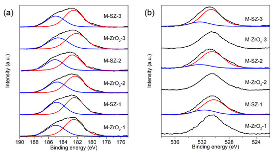 (a) Zr 3d and (b) O 1s XPS spectra of M-ZrO2-1, M-ZrO2-2, M-ZrO2-3, M-SZ-1, M-SZ-2, and M-SZ-3.