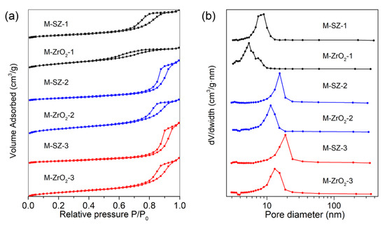 (a) N2 adsorption–desorption isotherms and (b) pore distribution of M-ZrO2-1, M-ZrO2-2, M-ZrO2-3, M-SZ-1, M-SZ-2, and M-SZ-3.