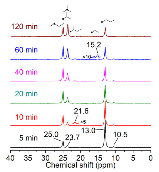 The isomerization of butane on the three catalysts was monitored by 13C MAS NMR spectroscopy, using 1-13C-n-butane as the reactant. Figure 6 shows the 13C MAS NMR spectra of the catalytic reaction at different times on M-SZ-2. The peak at 13.0 ppm corresponds to the adsorbed 1-13C-n-butane, and the peak at 10.5 ppm is assigned to the gaseous 1-13C-n-butane [32]. As the reaction time increases, peaks at 25.0 and 23.7 ppm appear, corresponding to 2-13C-n-butane and 13C-isobutane (1-13C-isobutane and 2-13C-isobutane), respectively. The by-product 13C-isopentane related to the peak at 21.6 ppm may be observed at 10 min, and a new peak at 15.2 ppm corresponding to 13C-propane appears at 60 min. The results of the catalytic reaction on different M-SZ catalysts at 433 K for 60 min are shown in Table 3, which shows that M-SZ-2 has the highest catalytic performance.