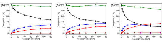 By deconvolution of the peaks attributed to LAs, the LAs of the three catalysts mainly contain five types of LAs, named LA1~5, as shown in Table 2. Among them, LA4 and LA5 are related to the original LAs on monoclinic zirconia, and LA1, LA2, and LA3 correspond to the sulfate-related LA on the surface of sulfated zirconia [30,31]. By comparing the 31P chemical shifts of TMP adsorbed on LA1, LA2, and LA3 shown in Table 2, the orders of the LA1~3 acid strength of the three catalysts are also M-SZ-2 > M-SZ-3 > M-SZ-1. However, the 31P chemical shifts of TMP related to LA1~3 of the three catalysts are similar, so the differences in LA1~3 acid strength are not significant. The LA amounts of three M-SZ are also recorded in Table 2.