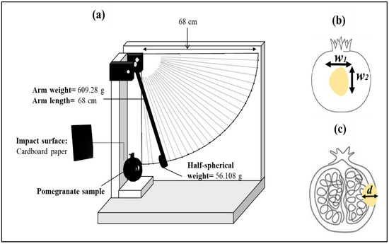 For the impact test, samples consisting of 40 pomegranates were damaged using the pendulum test, (Figure 1a) which allows better control and observation of the falling weight during testing when compared to the drop impact test, as stated by Opara et al. [19]. The pendulum test used in the current study consisted of a pendulum arm with a mass and length of 0.609 kg and 0.68 m, respectively, and a half-spherical weight with 0.056 kg mass connected to the arm of the pendulum that directly damaged the desired pomegranate fruit. The pendulum test was carried out by raising the arm that held the weight to the required angle and then releasing once to hit the pomegranate sample (cheek sides), as shown in Figure 1a. To create two different energy levels, the pomegranate fruit were hit by the half-spherical weight from an angle of 65° and 45°, representing high and low impact levels, respectively. The arm was caught by hand after each initial rebound to avoid multiple impacts, and a marker was used to mark the bruised region for further bruise recognition. The whiteboard with the graduated scale illustrated in Figure 1a was employed to read the initial rebound angle. A camera (Model: EOS FF0D, Canon Inc., Tokyo, Japan) was also used to capture the exact reading of the rebound angle. The absorbed energy was deduced from the difference between energies at both impacts and the rebound, using Equation (1) [5]. The absorbed energy for low (45°) and high (65°) impact levels were 1.189 ± 0.109 J and 2.298 ± 0.239 J, respectively.