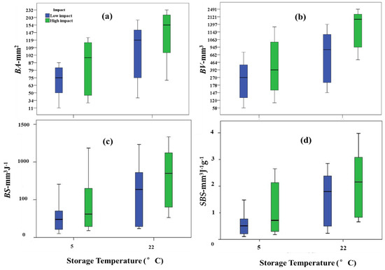 Bruise area (BA) (a), bruise volume (BV) (b), bruise susceptibility (BS) (c), and specific bruise susceptibility (SBS) (d) of pomegranate fruit impacted at different impact angles (45°, 1.18 J; and 65°, 2.29 J) and stored at 5 °C and 22 °C after 28 days of storage. The data are presented in box plots. Error bars represent the SD of the mean values of two readings per group (treatment).