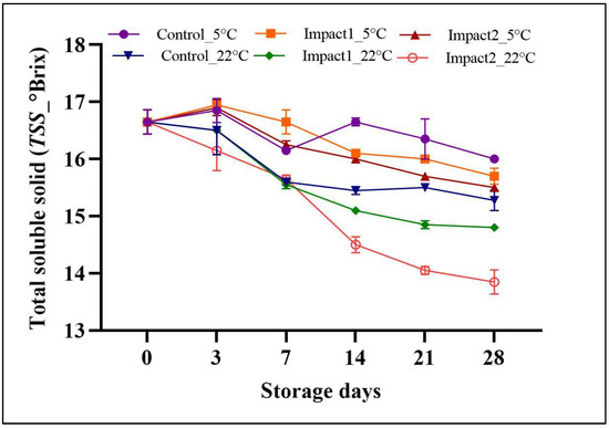 Total soluble solids (TSS) of non-bruised, low-impact (45°; 1.18 J), and high-impact (65°; 2.29 J) bruised fruit over 28 days of storage at 5 °C and 22 °C. Error bars represent the SD of the mean values of six readings per group (treatment).