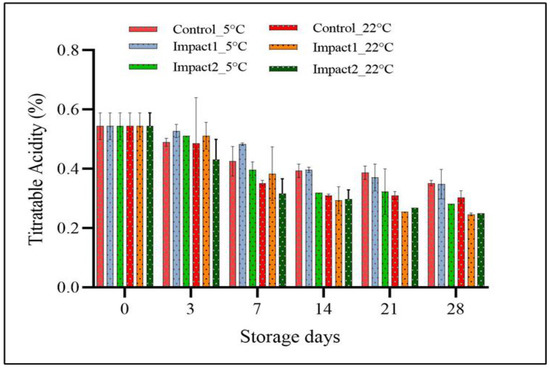 Titratable acidity (TA%) of non-bruised, low-impact (45°; 1.18 J), and high-impact (65°; 2.29 J) bruised fruit over 28 days of storage at 5 °C and 22 °C. Error bars represent the SD of the mean values of six readings per group (treatment).